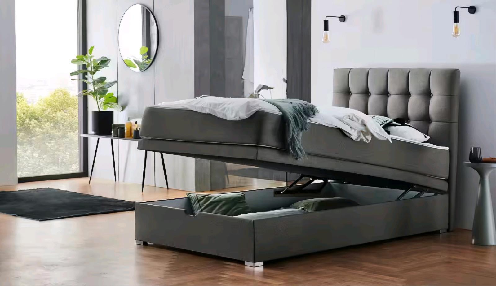 Effiziente Raumnutzung: Geräumiger Bettkasten mit Gasdruckfeder für müheloses Öffnen und Schließen.